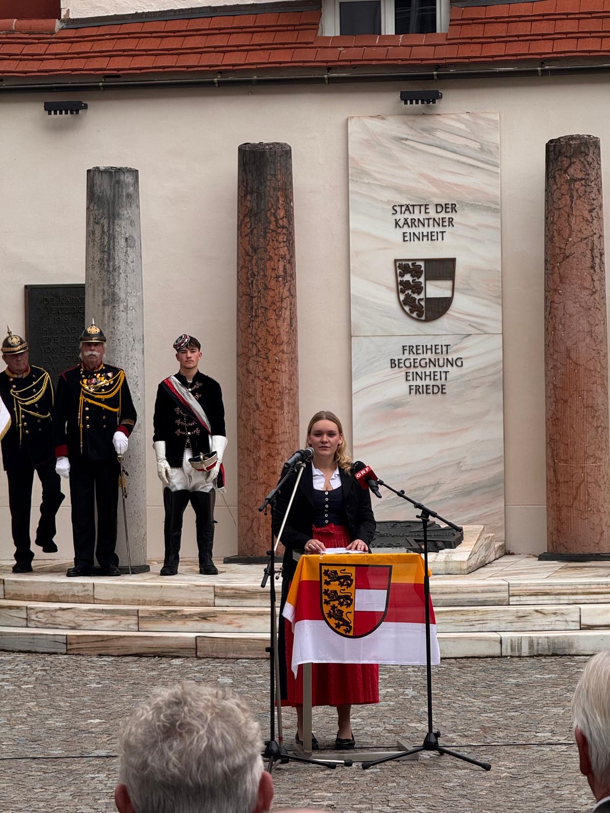 Nach den Grußworten von KHD – Obmann Andreas Mölzer, der auch kritische Worte zum Gedenkjahr 2025 fand, und des Obmannes des Kanaltaler Kulturvereins Karl-Heinz Moschitz bildete die Jugendrede der Villacher Schülerin Helena Wallner einen ersten Höhepunkt der Veranstaltung. Sie zeichnete die Vision eines freien und sicheren Kärntner Heimatlandes für die Jugend.